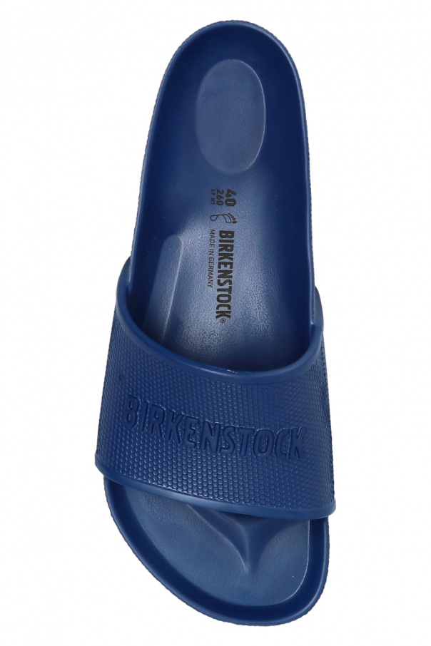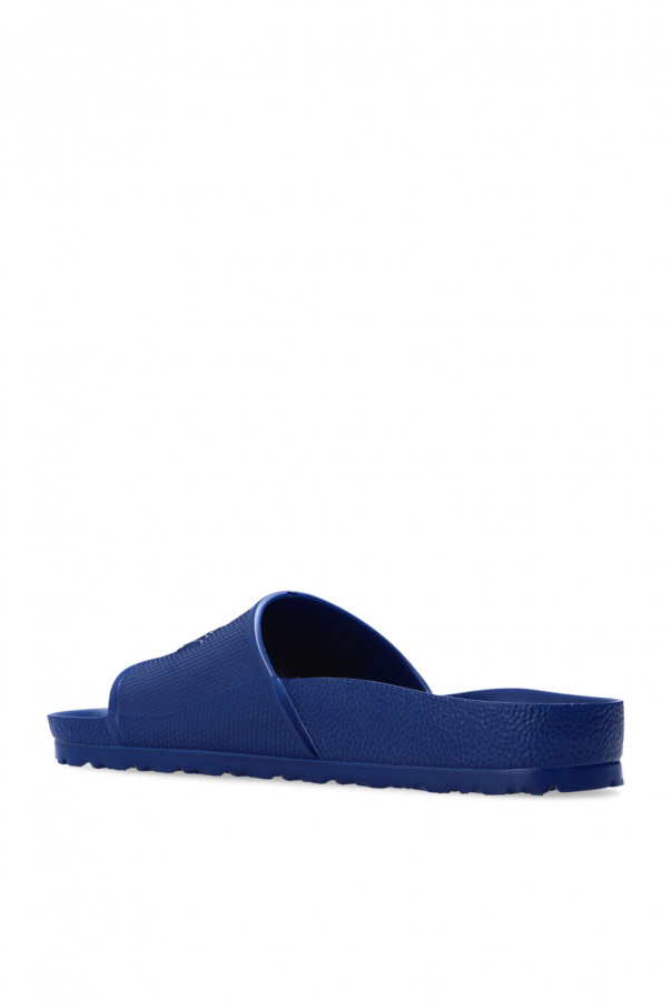 Navy ‘Barbados EVA’ slides from Birkenstock. Made entirely from EVA foam, this pair rests on a navy sole and is decorated with a raised logo.