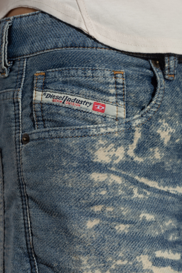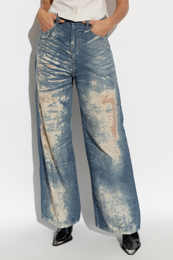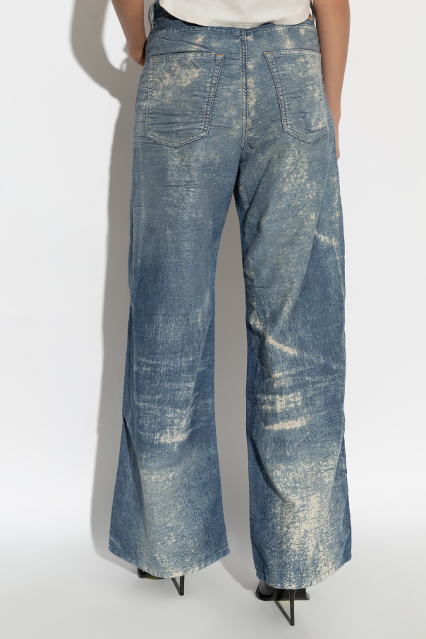 Introducing the 1996 D-SIRE-FSF Wide-Leg Jeans from the exclusive collection of renowned designer Diesel. These jeans, a paragon of sartorial elegance, are crafted for the discerning woman who appreciates timeless style and exceptional quality. Exquisitely fabricated from premium denim, these jeans feature a unique stretch blend for a superior fit. The dominant blue hue, complemented by a meticulously faded and distressed finish, exudes a chic, vintage charm. The wide-leg silhouette, which extends straight from the hips to the hem, provides a flattering and comfortable fit. Noteworthy details include the classic five-pocket design, complete with a small coin pocket adorned with the “Diesel Industry” patch and the designer\'s emblem. The jeans are secured with metal buttons, adding a touch of industrial sophistication. Additional features such as belt loops and metal rivets underscore their timeless appeal. Why You Should Buy This Product Expertly crafted from high-quality materials for lasting durability. Unique vintage-inspired design with meticulously distressed details. Comfortable wide-leg fit that flatters all body types. Classic five-pocket styling with distinctive Diesel branding. Versatile fashion statement, perfect for both casual and chic ensembles.