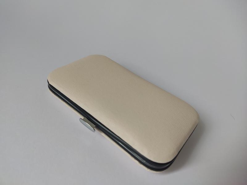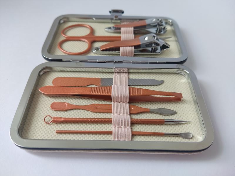 Цвет набора персиковый. В наборе есть как кусачки, ножницы так и пилочки.