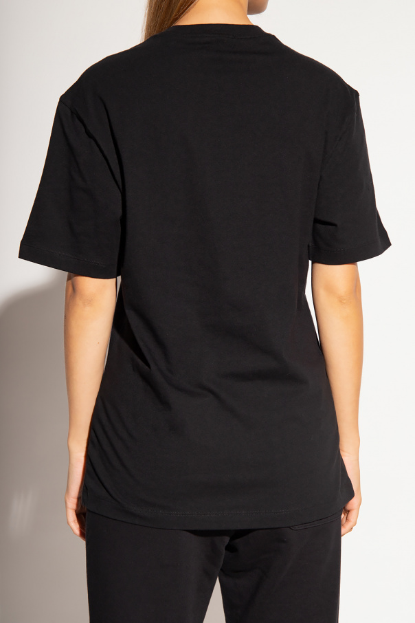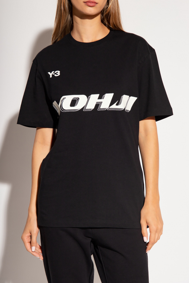 Black T-shirt from Y-3 Yohji Yamamoto. Made of cotton, this short sleeve design features a white logo print and ribbed crew neck.