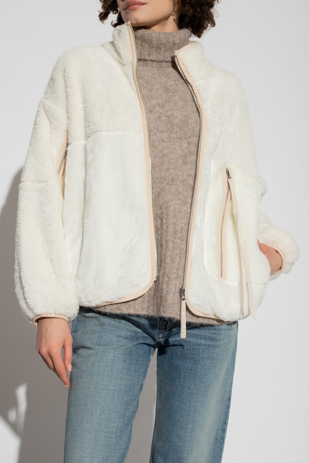 Cream \'Lakne’ jacket with a standing collar from UGG. Crafted in faux fur, this style features a zip fastening, four zip pockets (one on the sleeve), and a cotton lining.