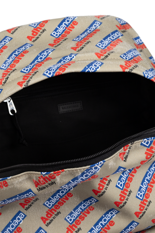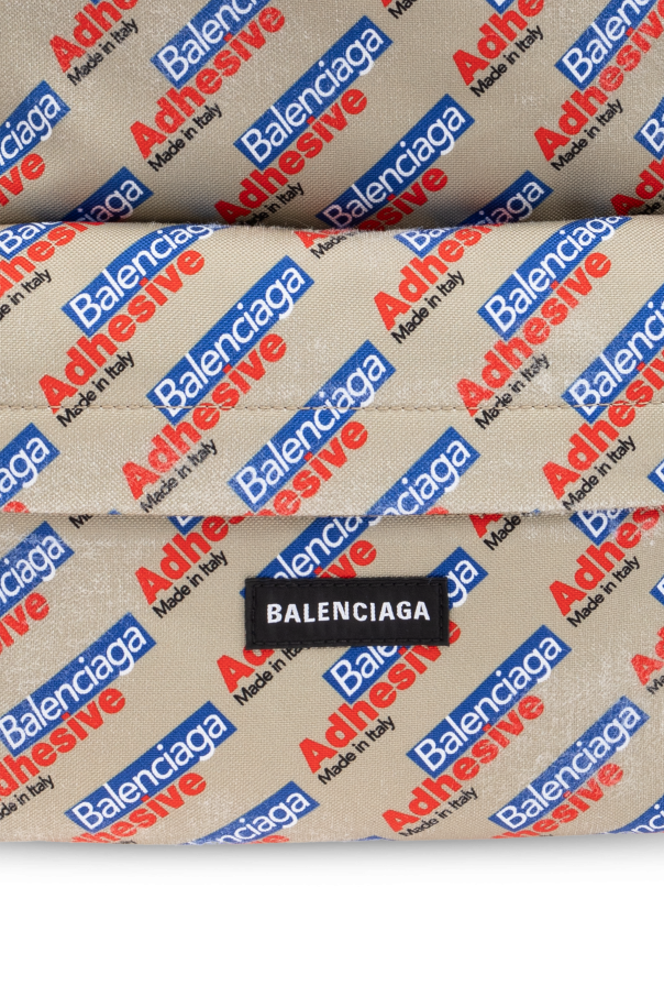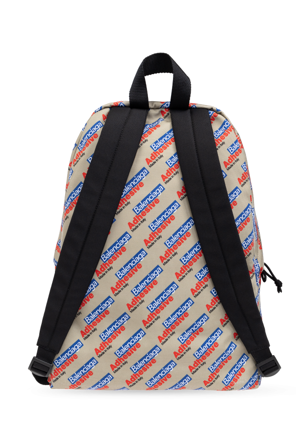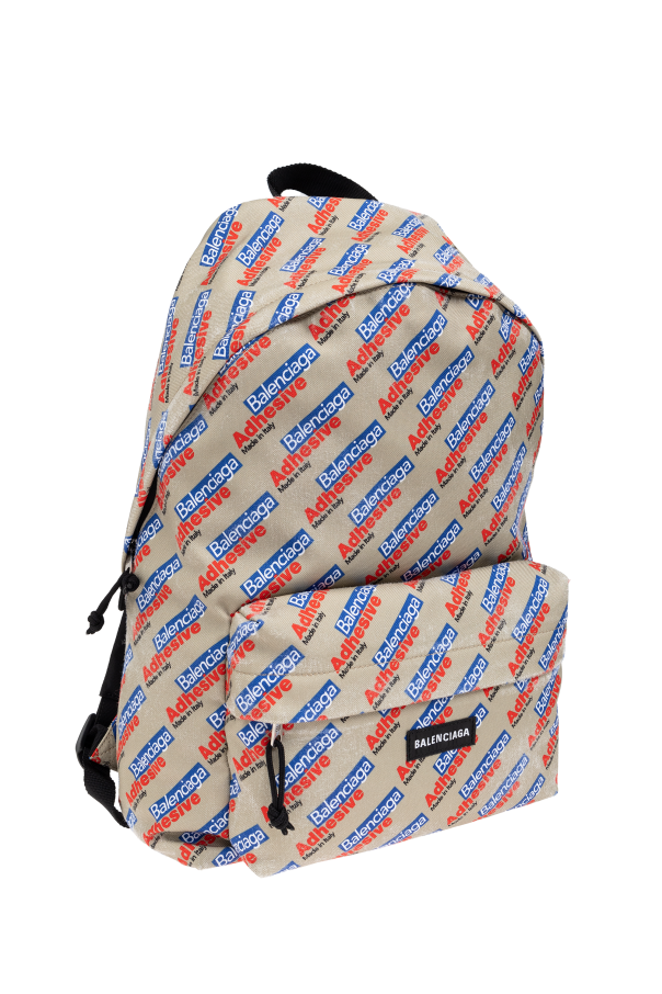 Introducing the Printed Backpack from the exclusive Balenciaga collection, a testament to unparalleled craftsmanship and contemporary flair. This exquisite backpack is adorned with a vibrant pattern of \"Balenciaga Adhesive\" lettering in rich red and blue against a beige backdrop, exuding a sophisticated multicolor aesthetic. Crafted from a durable synthetic fabric, this backpack embodies both resilience and elegance. Its classic silhouette features a spacious main compartment and a front zipper pocket, enhanced by a black patch emblazoned with the iconic Balenciaga logo. The adjustable, wide black straps ensure supreme comfort, making it a versatile companion for any occasion. Why Choose This Product? Exclusively designed by Balenciaga, an epitome of haute couture. Distinctive multicolor pattern with signature branding. Robust materials for longevity and style. Ample storage with a secure interior zip pocket. Adjustable straps for personalized comfort.