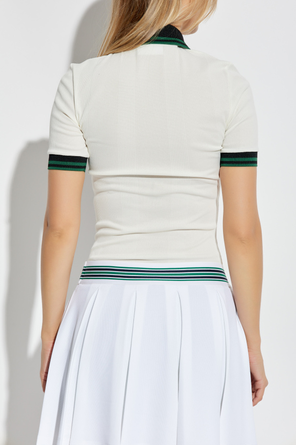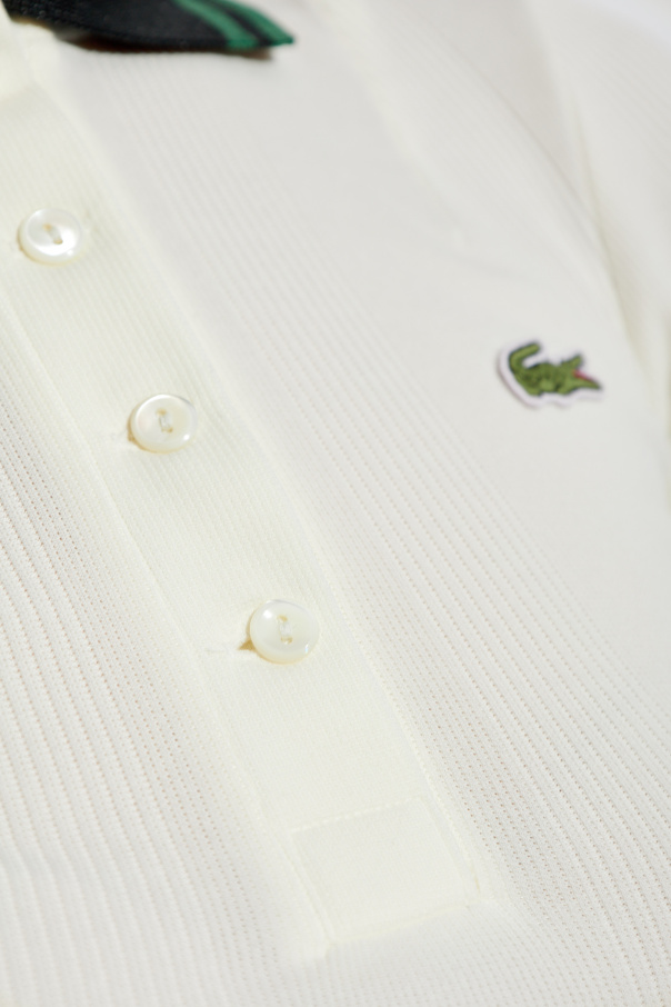 Experience the epitome of sophistication with the Polo with Logo by the renowned designer Lacoste. This exquisite piece, predominantly in a creamy hue, exudes a timeless elegance that seamlessly blends with a sporty charm. Crafted from a soft and elastic fabric, this polo ensures unparalleled comfort and effortless style. The classic cut features short sleeves, adorned with contrasting green and black stripes, enhancing its chic and athletic appeal. The traditional collar, in black with green stripes, and the three pearl buttons on the placket, add a touch of refinement. A subtle, embroidered green crocodile logo on the left chest serves as a hallmark of Lacoste\'s iconic heritage. Attention to detail is paramount, with ribbed sleeve cuffs accentuated by green and black stripes, exemplifying the meticulous craftsmanship synonymous with luxury brands. Styled perfectly with a white pleated skirt and sporty shoes, this polo is ideal for both casual and more formal sporting occasions. Why Buy This Product? Soft and stretchy fabric for ultimate comfort Classic design with elegant contrasting accents Iconic Lacoste green crocodile logo Perfect fit that accentuates the silhouette Versatile styling for various occasions