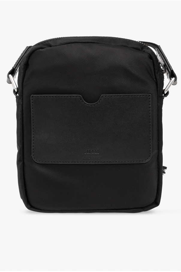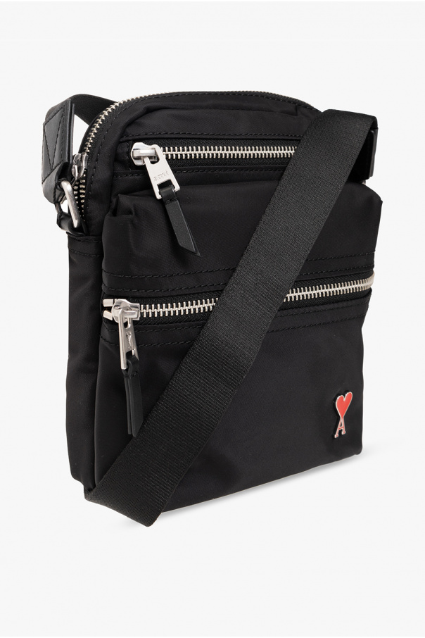 Black belt bag from Ami Alexandre Mattiussi. Crafted from leather, this model features a zip fastening, two front zip pockets, Ami de Coeur logo appliqué with red enamel, back pocket, adjustable belt, silver-tone metal hardware and one internal compartment with one velcro-fastened pocket.