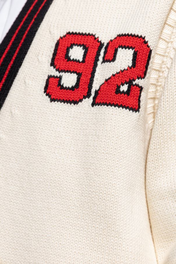 White, red and black cardigan from Alexander McQueen. Made of a cotton and wool blend, this design features button fastenings, embroidered lettering with the brand’s signature skull motif, V-neck, two slip pockets and ribbed trims at the hem and cuffs.