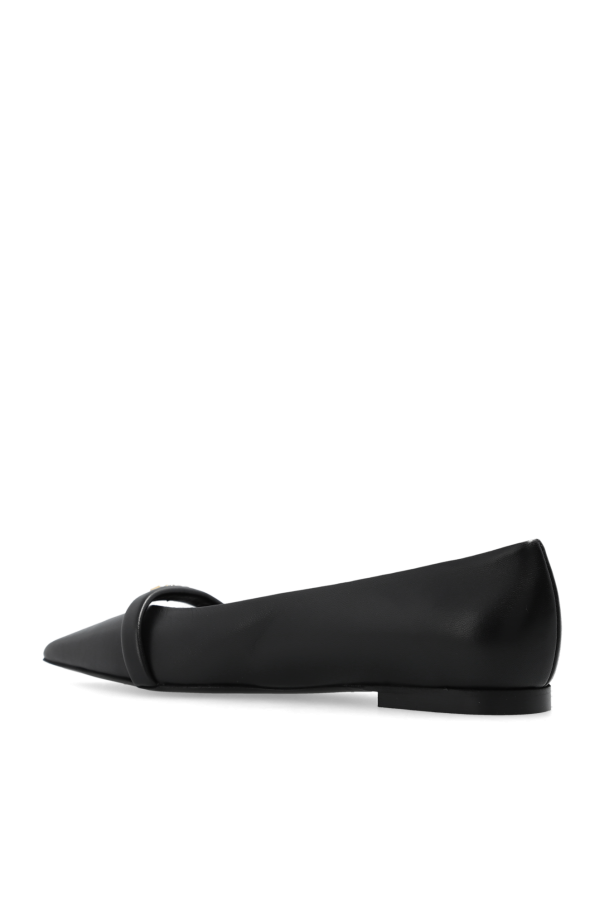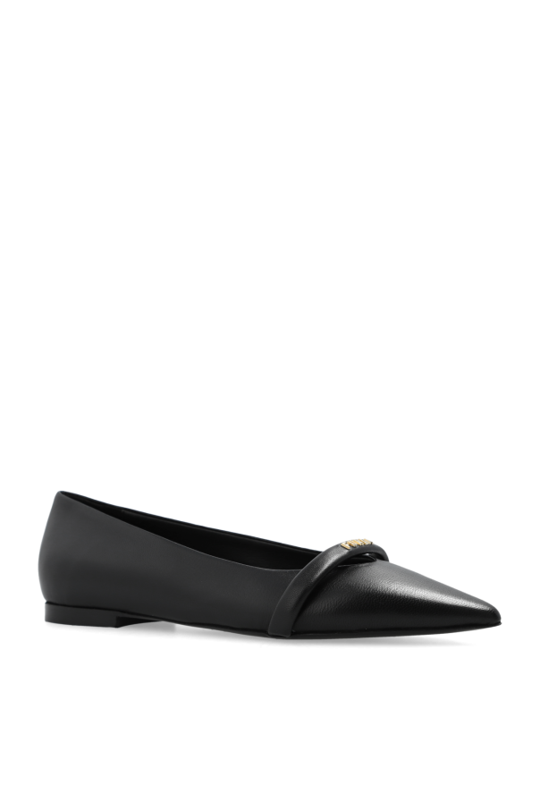 Black ‘Core’ ballet flats from Furla. Made of leather with a pointed-toe silhouette, this model sits on a black rubber sole and features a frontal strap accentuated with a gold-tone metal logo.