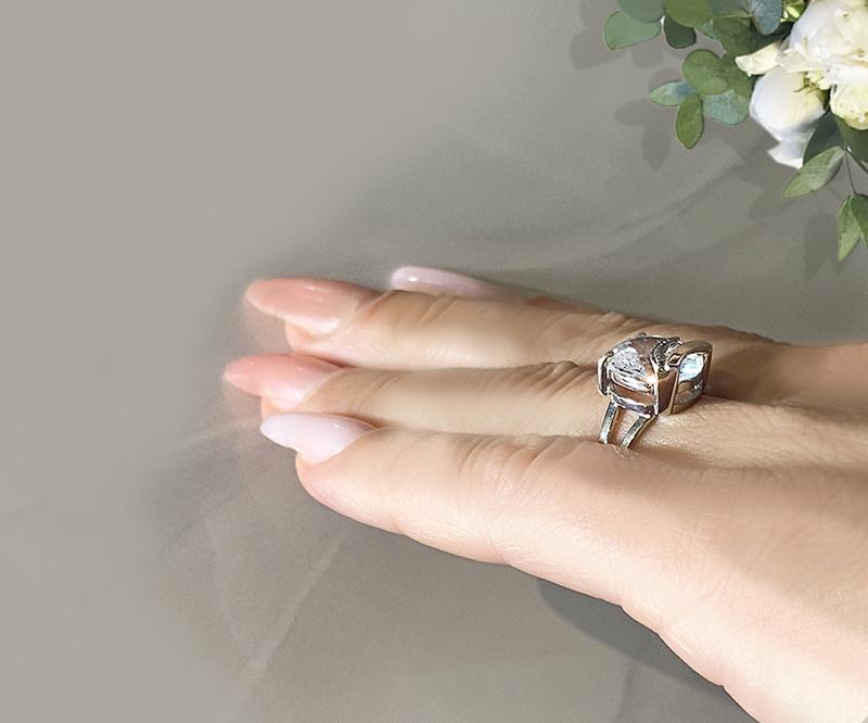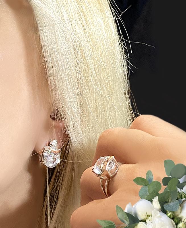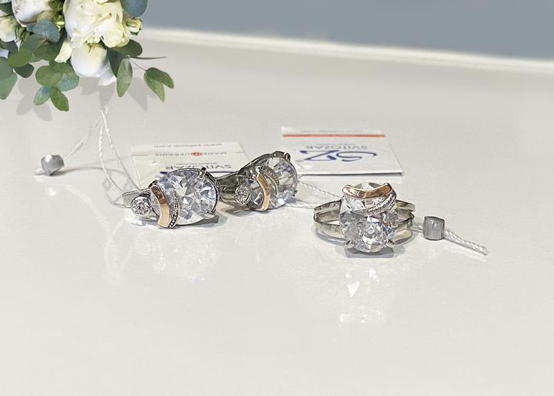 Новый серебряный набор с золотыми пластинами и крупным белым прозрачным камнем.
