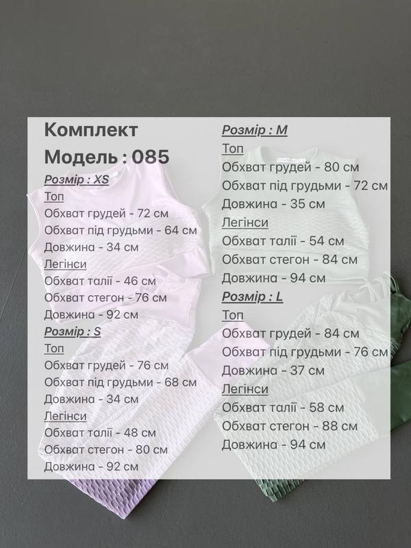 ✔️Фото/відео — реалДуже класний фітнес комплект із топа і легінсів . З якісної фактурної , щільної жакардової тканини , яка не світить та приховує недоліки шкіри . Між сідничками у середньому шві є резиночка та стяжка , яка надає сідничкам обʼєму і виглядає дуже гарно . По низу фактурна тканина переходить у манжет із гладенького еластичного біфлексу .