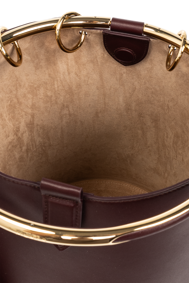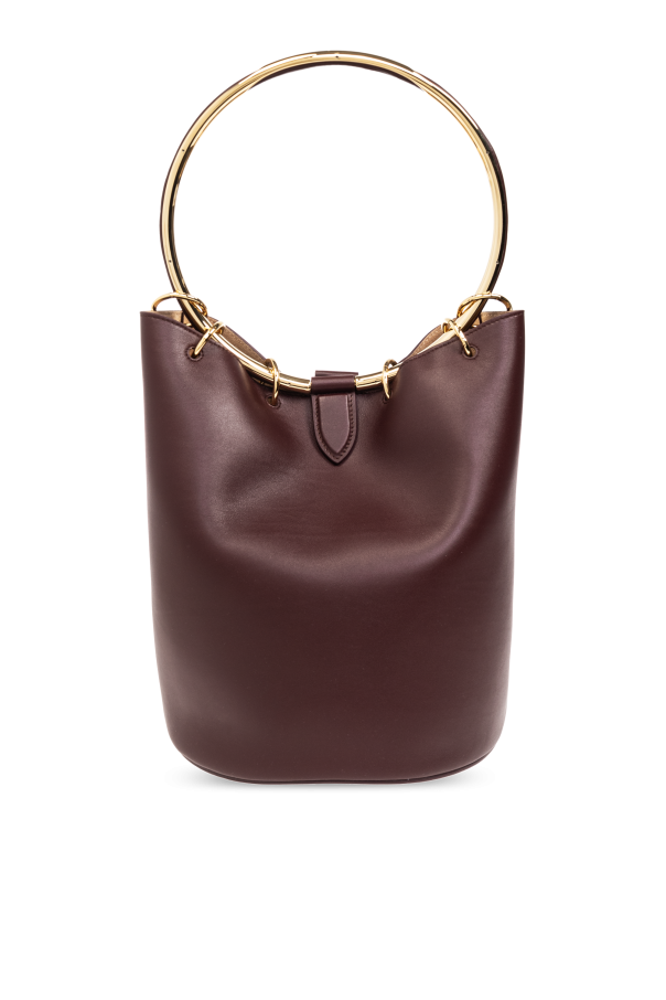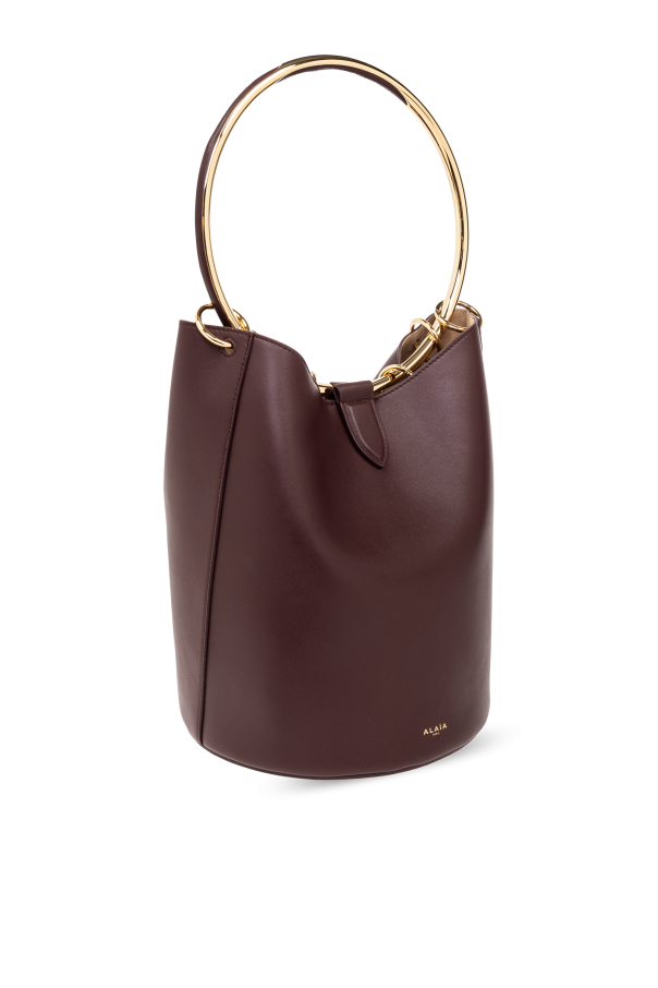 Introducing the ‘Ring’ Handbag by Alaïa, a testament to modern elegance and sophistication. Crafted from smooth, high-quality calfskin leather, this handbag boasts a trapezoidal silhouette with softly rounded bottom edges, presented in a rich burgundy hue that epitomizes luxury. The bag\'s distinctive feature, a metal ring serving as the handle, is finished in a striking gold tone, offering a beautiful contrast to the main color and adding a touch of grace. Gold-tone hardware accents further elevate the design, ensuring that every detail contributes to its exquisite appearance. A practical yet stylish addition, the detachable zippered pocket made from the same premium leather, enhances functionality without compromising on style. The front of the bag discreetly showcases the designer\'s logo, signaling refined taste and exclusivity. Its interior, lined with a lighter shade of suede, reflects a commitment to high-quality finishing and luxury standards. The bag also features a magnetic closure and an internal compartment and zippered pocket on a strap, blending security with elegance. Why Purchase This Product? Elegant design with a modern twist, suitable for women who value elegance and quality. Made from 100% high-quality calfskin leather, ensuring durability and a luxurious feel. Functional features such as a magnetic closure, an internal compartment, and a zippered pocket enhance practicality. Gold-tone metal ring and hardware accents provide a sophisticated contrast and elevate the bag’s overall aesthetic. Designed by renowned designer Alaïa, making it a covetable piece in any fashion collection.
