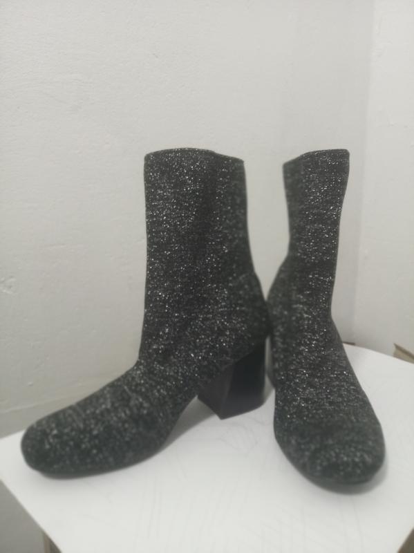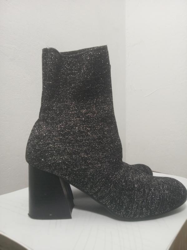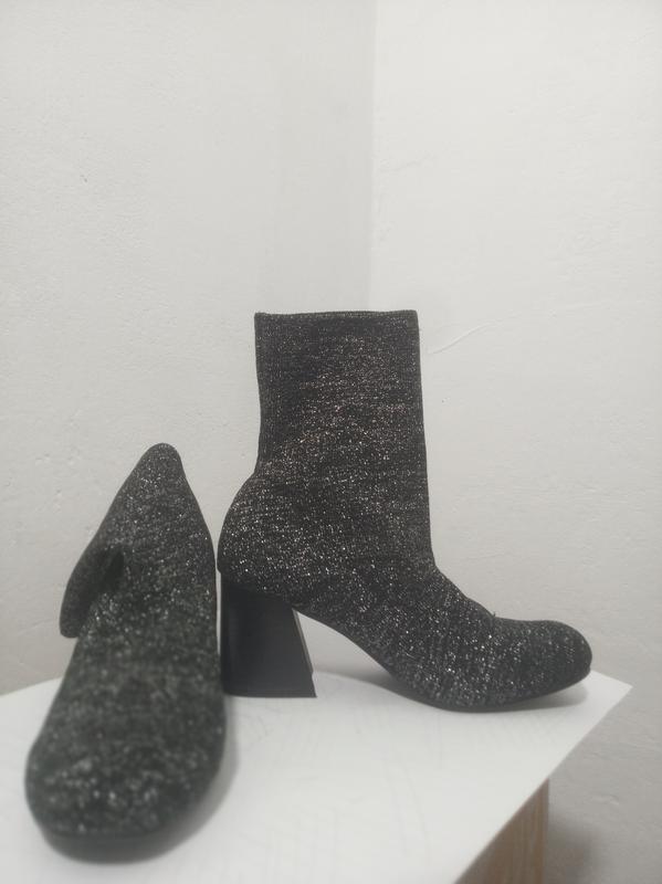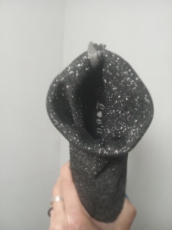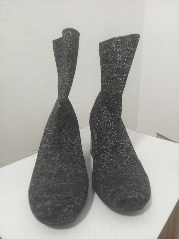 Трендовые сапоги-чулки черные с серебристым люриксом. Состояние почти идеальное (узились всего несколько раз). Размер 39 (на ногу 24,5-25 см. Высота подбора 7 см, длина чулки от пятки ~17 см. LovIt