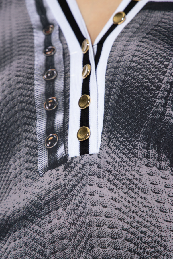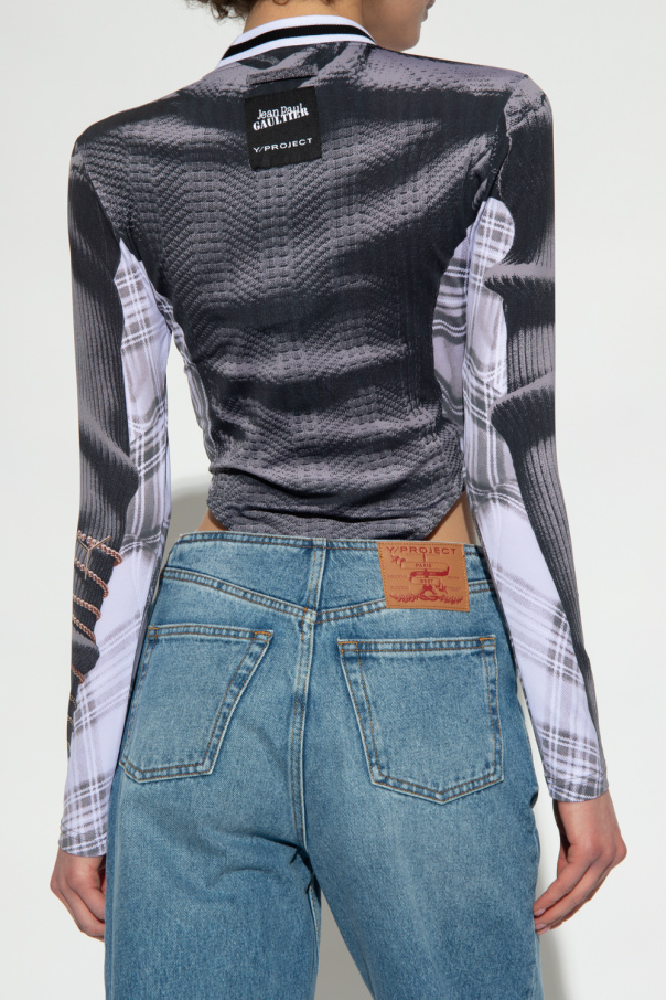 Grey, black and white bodysuit from Y Project x Jean Paul Gaultier. Embellished with a check pattern and Trompe l’Oeil print with a motif of sweater, this style fastens with buttons on the front and snaps at the bottom and features a V-neckline with black and white stripe ribbing and long sleeves.