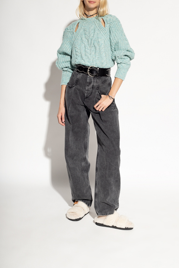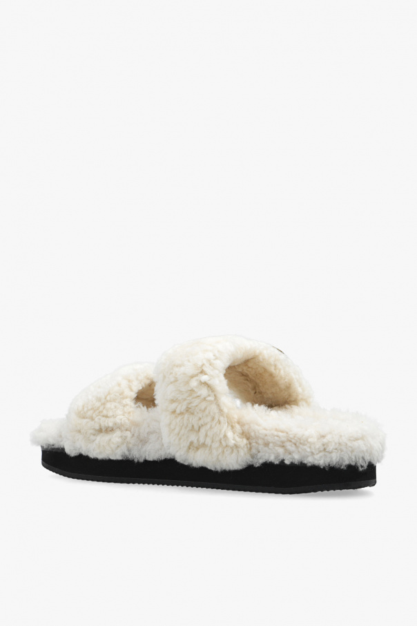Cream ‘Frikon’ slides from Isabel Marant. Crafted from sheep fur, this model sits on a black rubber sole and features a decorative brown strap with an antiqued gold-tone buckle.
