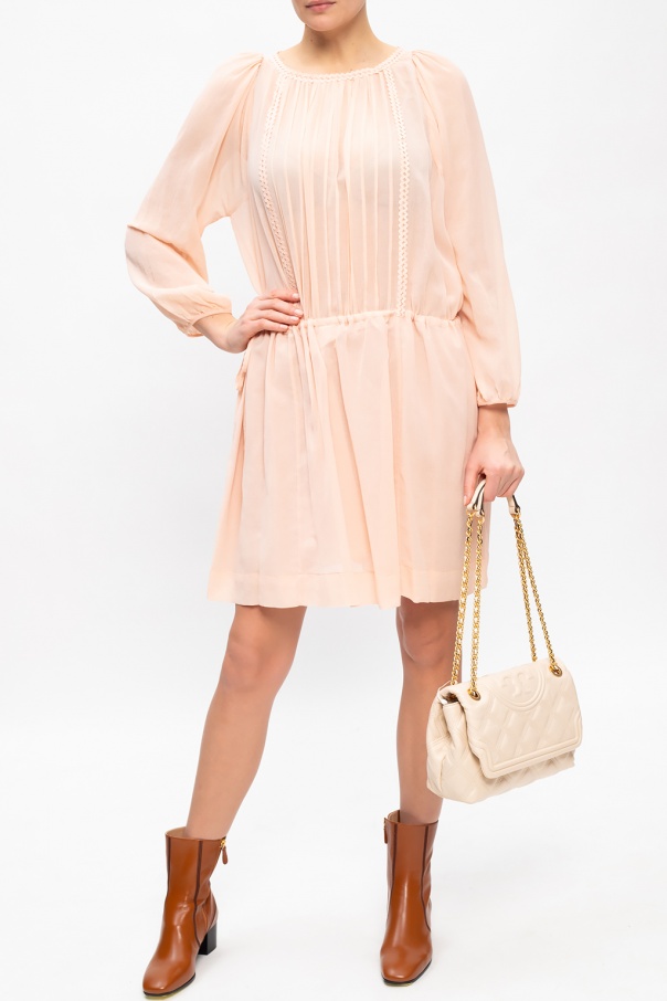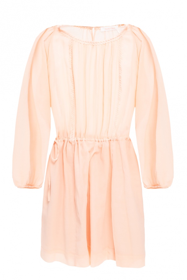 Pink dress from See By Chloé. Crafted from a semi-sheer cotton fabric, this long-sleeved style features a single button fastening on the back, cinching drawstrings at the waist, decorative finish and a flared skirt.