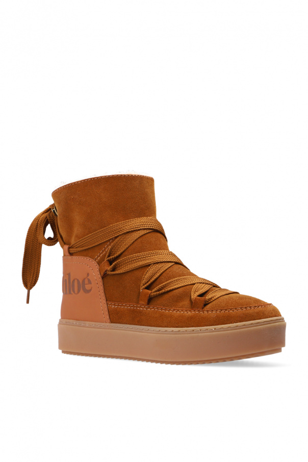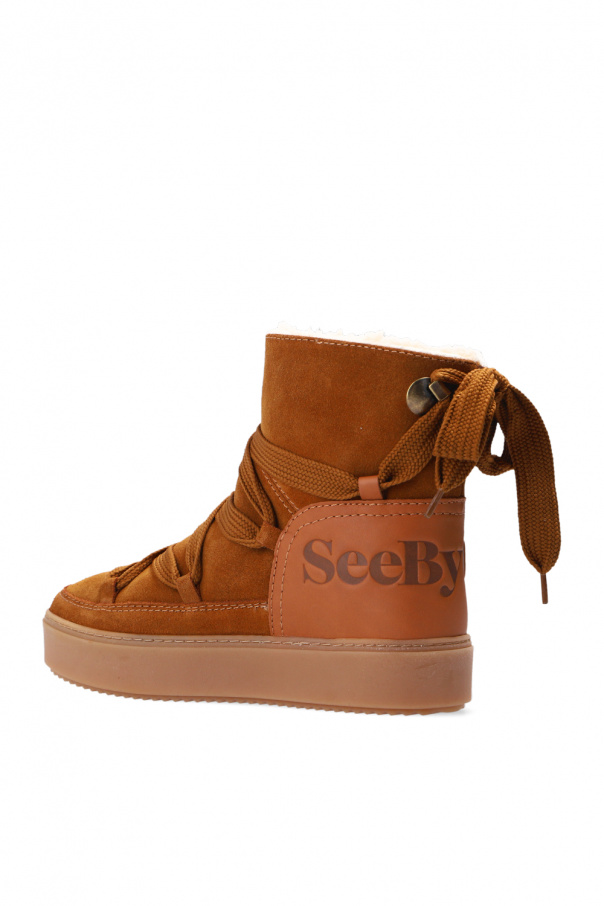 Brown ‘Charlee’ suede ankle boots from See By Chloé. Crafted from suede, this pair is complete with an embossed logo, decorative ankle ties, shearling lining and brown rubber sole.
