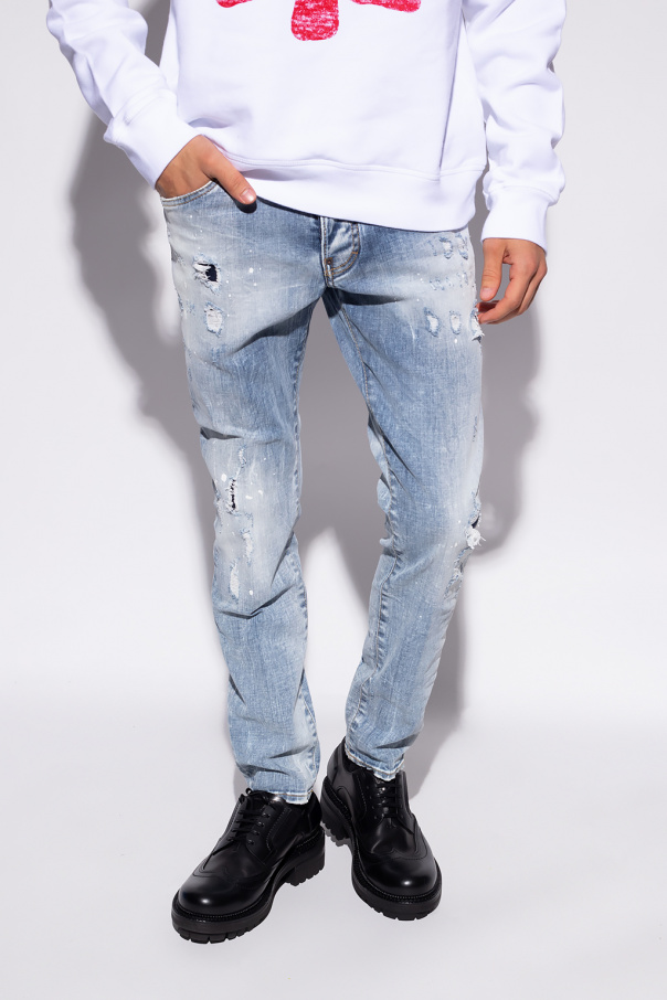 Light blue ‘Skater’ jeans from Dsquared2. Cut with a low-waisted silhouette, this pair features button fastenings, classic five pockets, a back logo patch and the brand\'s signature paint splatters and distressed effects.