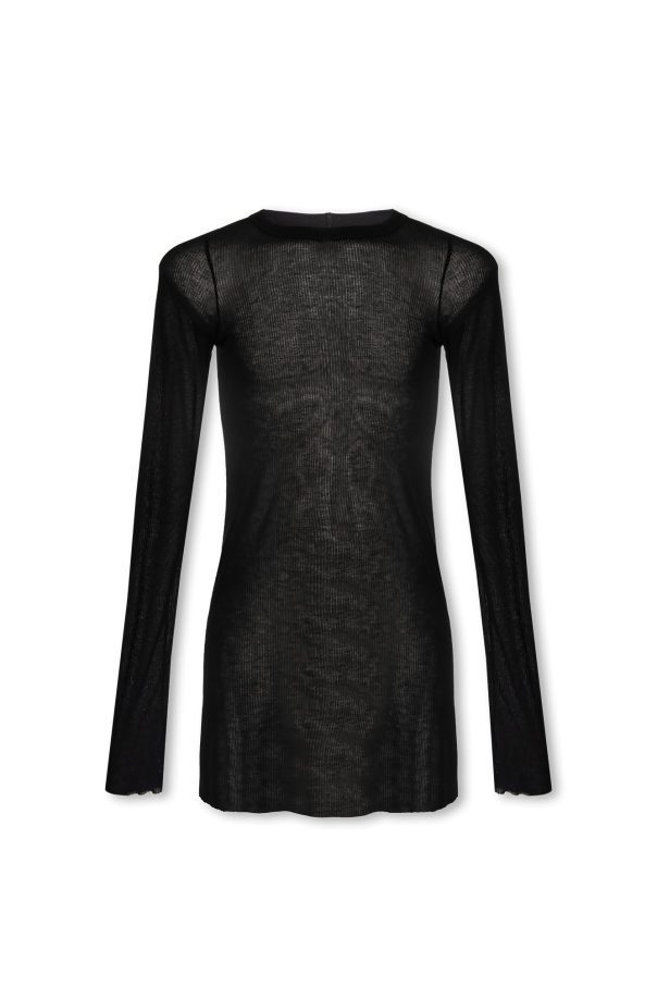 Black crewneck T-shirt from Rick Owens. Crafted from ribbed knit with a form-fitting silhouette, this style features a round neck, raw trims and long sleeves.