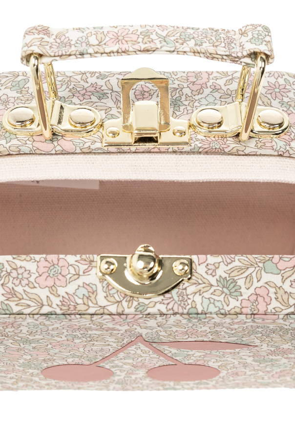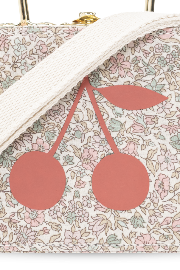 Cream ‘Aimane’ shoulder bag from Bonpoint. Crafted from organic cotton, this design fastens with a snap and showcases a multicoloured pattern with flowers and the brand\'s signature cherry motif. It is complete with an adjustable shoulder strap, gold-tone metal hardware and one internal compartment.