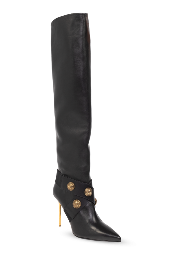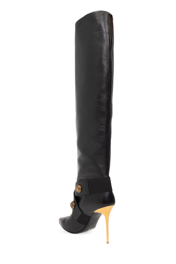 Black ‘Alma’ heeled boots from Balmain. Made of leather, this pair features round logo-embossed metal details, metal heel in gold-tone, pointed toe and black leather sole.