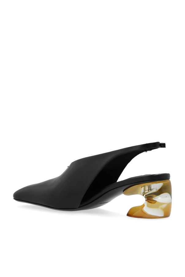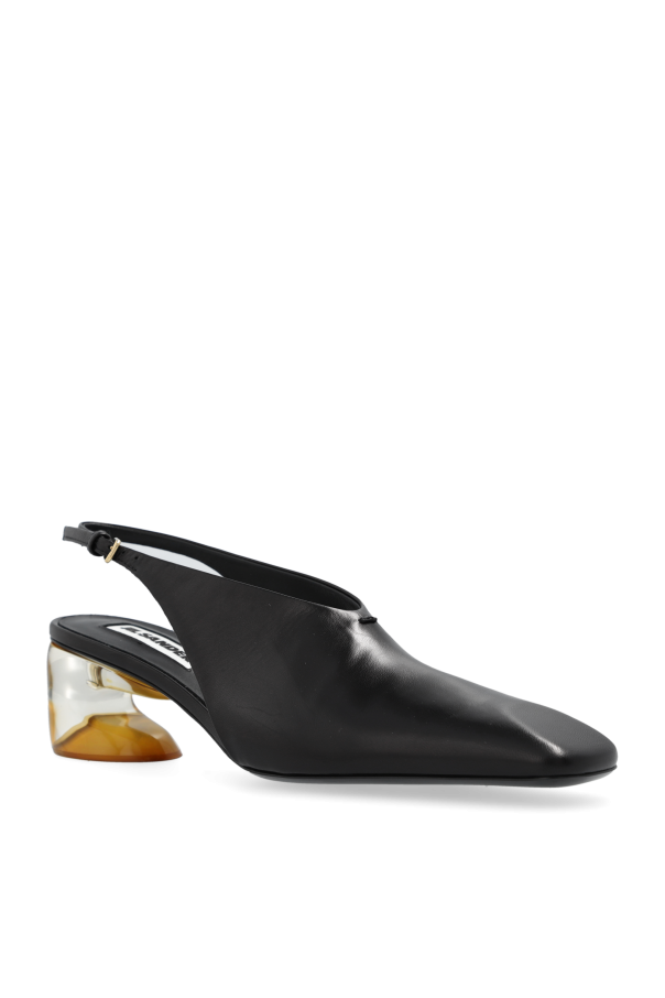 Introducing the epitome of modern elegance and sophisticated design - the JIL SANDER Black Heeled Shoes. Crafted with the utmost precision, these shoes are a testament to the luxurious aura of exclusive designer wear. The sleek, black leather exterior boasts a smooth finish, seamlessly encapsulating the essence of luxury. The distinctive shape, featuring a sharp, tapered toe and an open back with a strap secured by a small gold clasp, exudes refinement and contemporary allure. The heels\' unique block shape, adorned with marble-like insets in shades of amber and white, serves as a striking decorative element, elevating the overall aesthetic. Constructed from premium goat leather for both the outer and inner layers, these shoes promise durability and comfort. The sole, a combination of leather and rubber with anti-slip inserts, ensures stability and grace in every step. The subtle placement of the \"JIL SANDER\" logo on the inner side of the heel strap adds a tasteful touch of brand identity, distinguishing these shoes as a work of art from a renowned designer. Why Purchase This Product? Exclusivity and elegance encapsulated in a pair of shoes designed by the esteemed JIL SANDER. Luxurious goat leather construction ensures both comfort and longevity. Unique heel design with marble-like detailing adds a sophisticated and artistic touch. The sleek black color and contemporary shape make these shoes a versatile choice for any upscale outfit. Anti-slip sole inserts provide stability, allowing for confident and graceful movement.