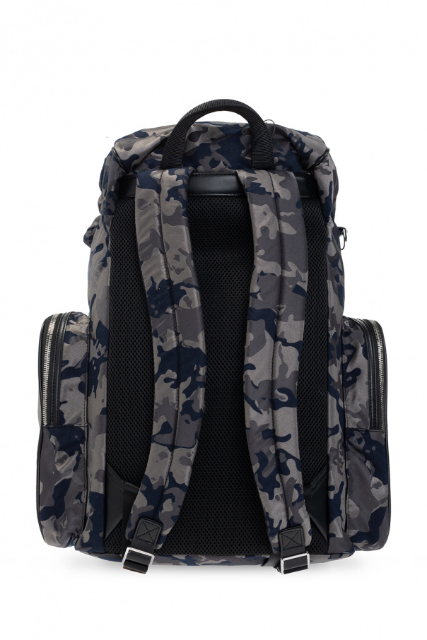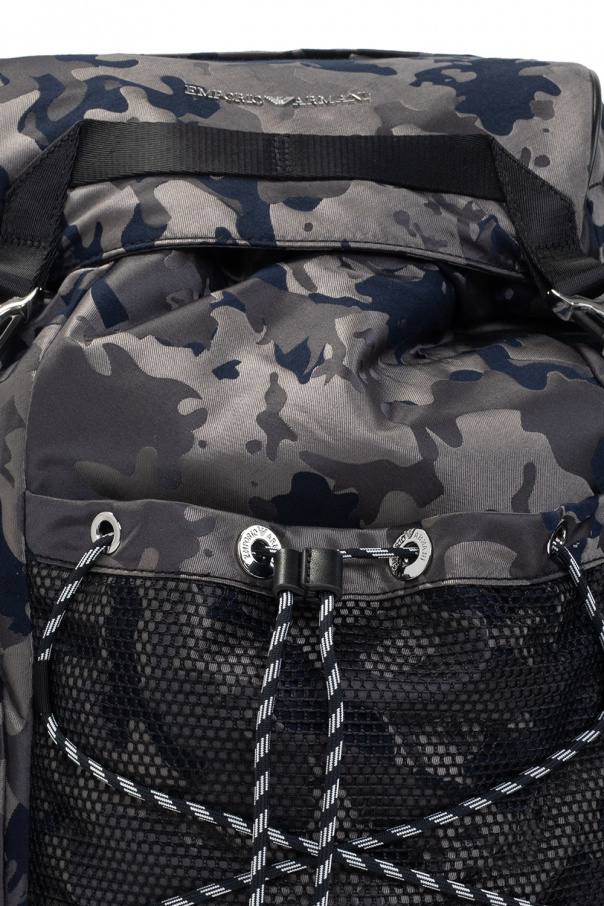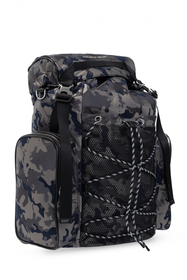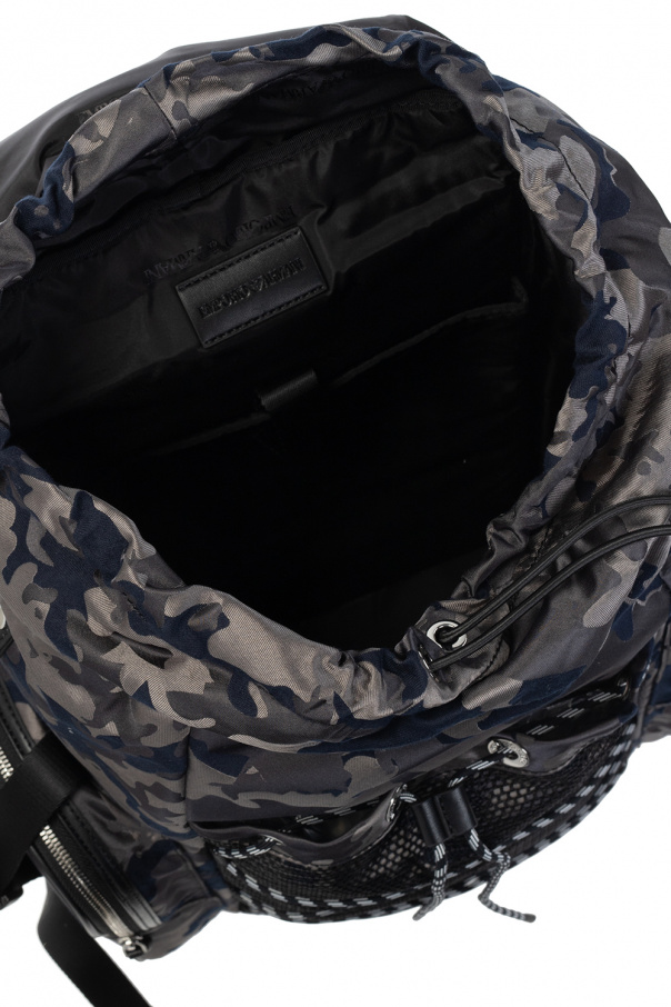 Grey, black and navy backpack from Emporio Armani. Fastened with snaps and drawstrings, this model features a camo motif, metal logo, multiple pockets, half-round handle, adjustable straps and one internal compartment with two slip pockets and a pocket with hook-and-loop closure.