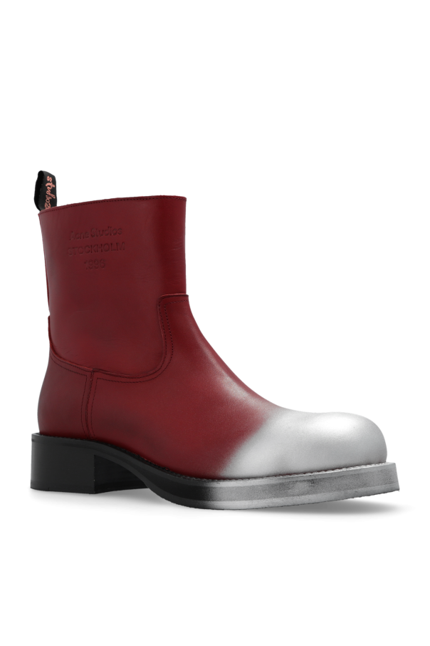 Dark red ankle boots from Acne Studios. Made from calf leather, this model sits on a black rubber sole and showcases an embossed logo on the side, zip puller detailing and a silver-tone round toe.