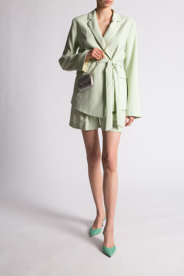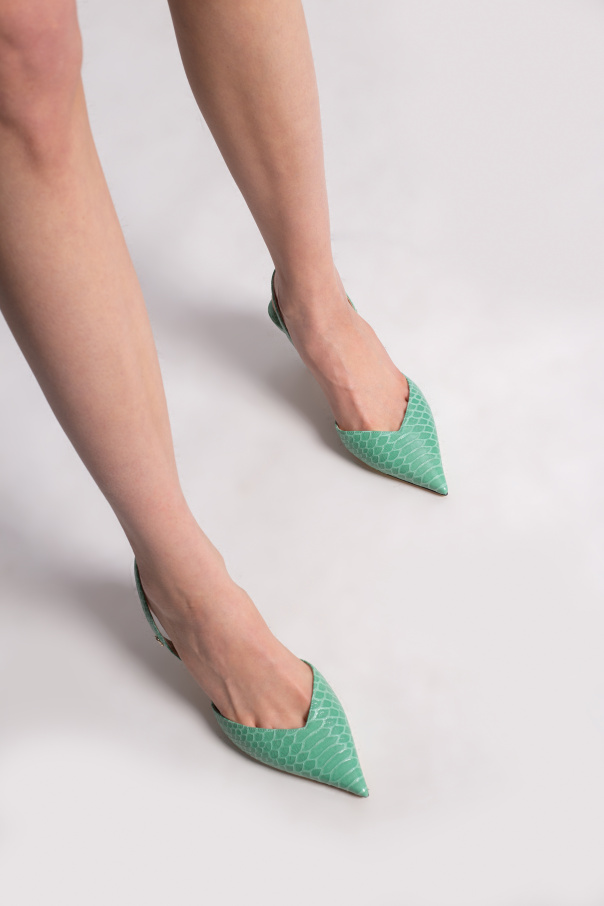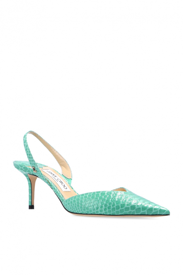 Green and blue \'Thandi\' stiletto pumps from Jimmy Choo. Made of leather with a snake skin effect, this pair boasts a pointed toe silhouette, a gold-tone logo plaque and a beige leather sole.