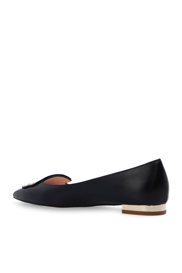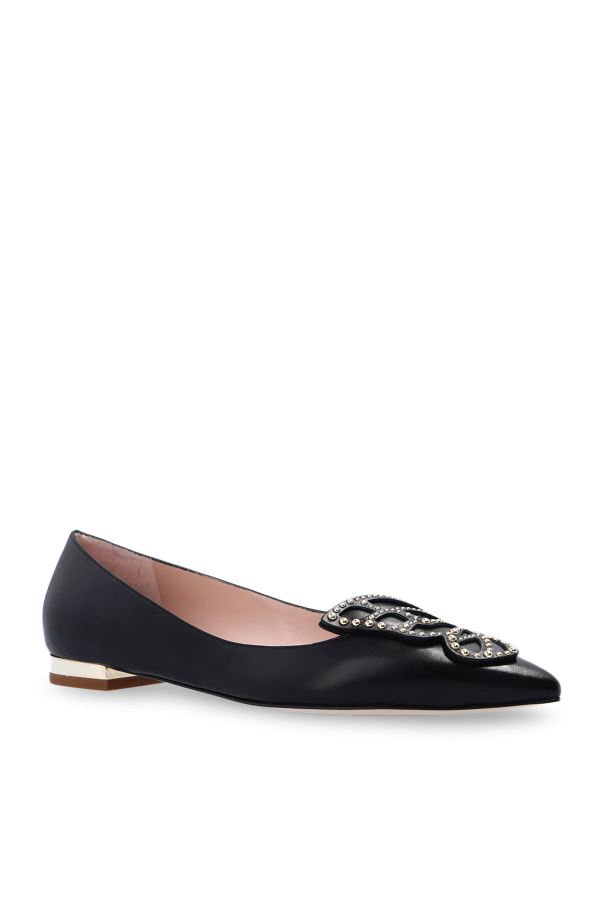 Black ‘Butterfly’ shoes from Sophia Webster. Made of leather, this model features a wing motif with gold-tone studs, pointed toe with gold-tone elements and beige leather sole with the label’s signature heart motif.