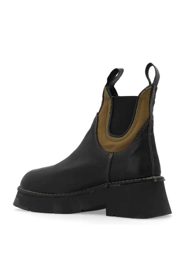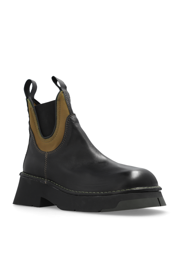 Black and green ‘Kaya’ ankle boots from Miista. Made of leather with a slip-on silhouette and round toe, this model sits on a black and dark green rubber sole and features two pull tabs and elastic panels on the sides.