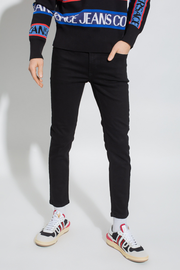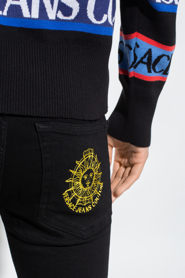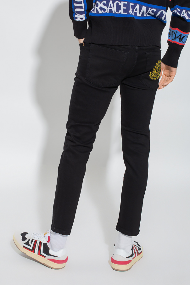Black skinny jeans from Versace Jeans Couture. Distinguished by yellow graphic embroidery with a motif of sun and logo at the back pocket, this pair features a zip fly with a button, a logo patch on the front and classic five pockets.