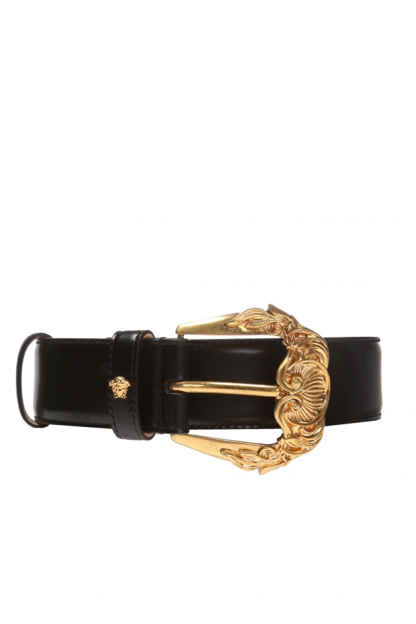 Black belt from Versace. Made of calf leather. Enriched by signature Medusa head accent. Gold-tone metal buckle features baroque embellishment.