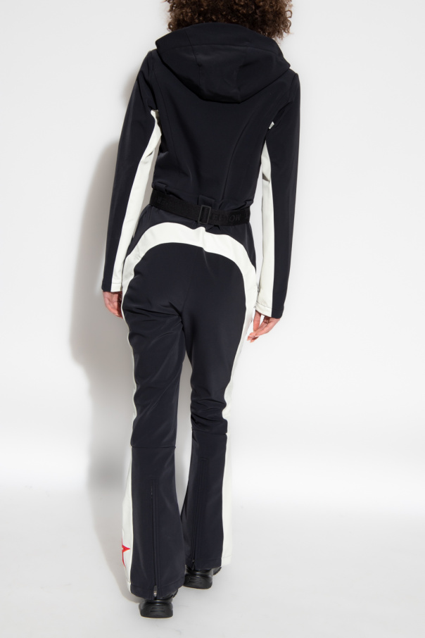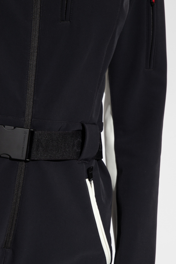 Black and white insulated hooded ski suit from Perfect Moment. Made of waterproof, quick drying, breathable Toray Dermizax™ fabric, this design features a zip fastening, removable waist belt, red logo embroidery, four zip pockets, long sleeves and flared legs with zip details.