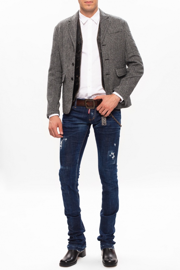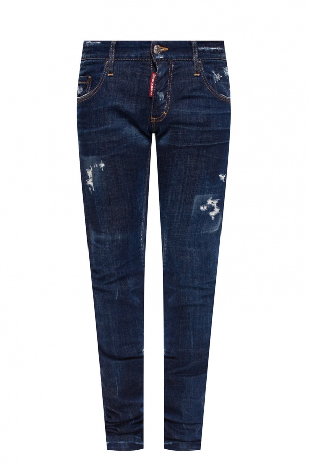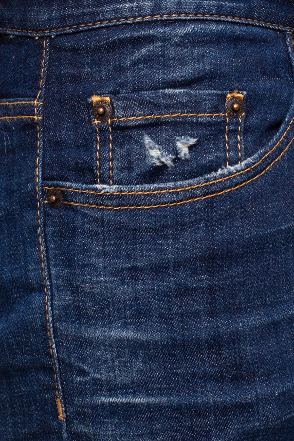 Blue ‘Straight Leg Sharpei Jean’ jeans from Dsquared2. Fastened with buttons, this straight leg design features yellow stitching details, logo patches, a raw cut edge, three front pockets and two back pockets.