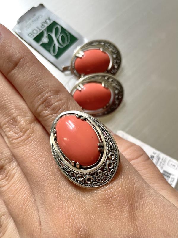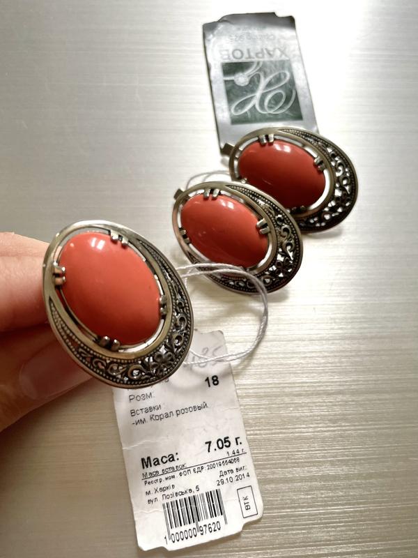 Красивый, нежный набор украшений. Серебро 925+искусственный корал. Кольцо: размер 18, общая масса 7.05г, масса вставок 1.44 г. 1435 грн. Серьги: общая масса 10.75г, масса вставок 2.88г. 1650 грн. Производитель завод Хартов, г.Харьков. Набором дешевле.