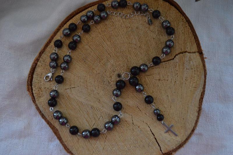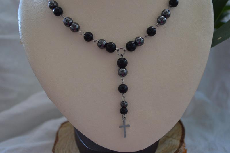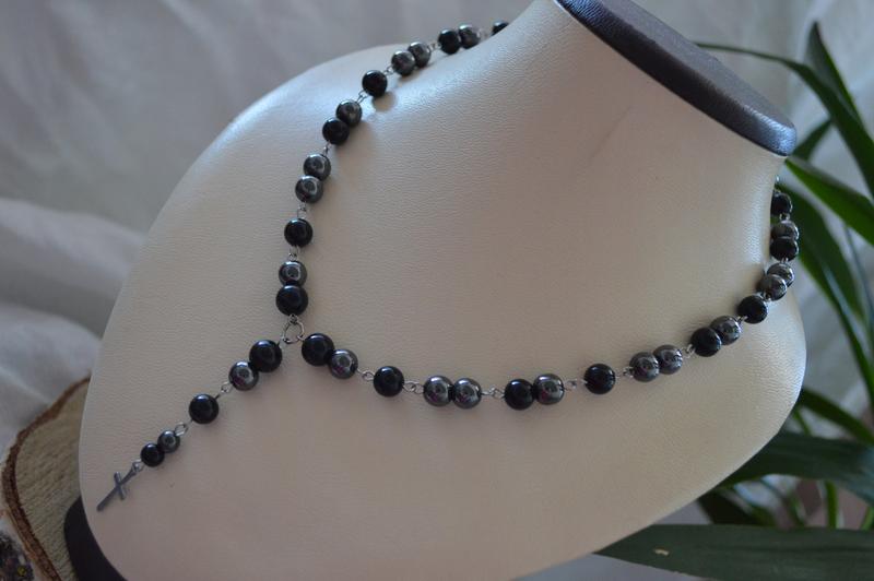 Отличная идея для недорого и эксклюзивного подарка! Розарий, бусы - четки из натурального черного обсидиана, гематита и крестом из гематита полностью на фурнитуре из нержавеющей стали. Это новое слово в создании бижутерии. Нержавеющая сталь не облазит, не темнеет, не ржавеет, не вызывает аллергию! Такие украшения можно носить долгие годы, в них можно даже купаться! Длина по шее 47-52 см.