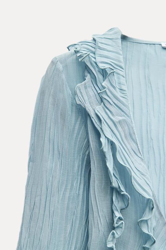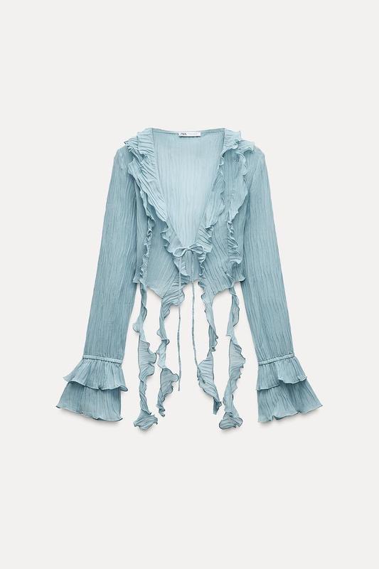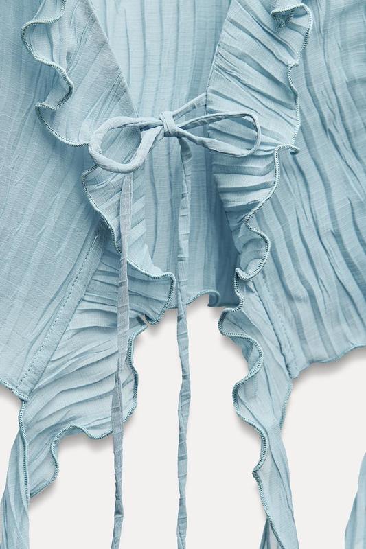 Куртка с V-образным вырезом и длинными рукавами и оборками. Завязки спереди. Бахрома с воланами.