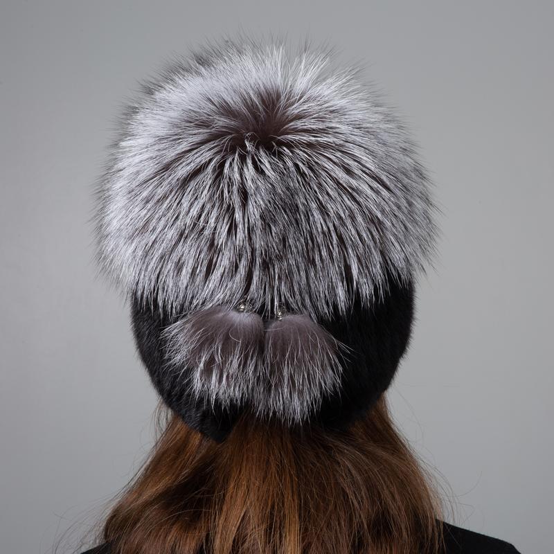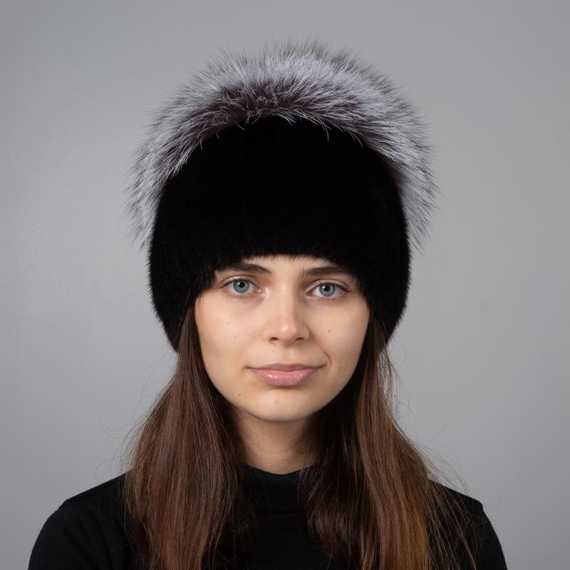 Женская зимняя шапка на вязаной основе из натурального меха норки и помпона из меха лисы ( чернобурка ), цвет: Черный, размеры от 54 до 60 см обхвата головы.