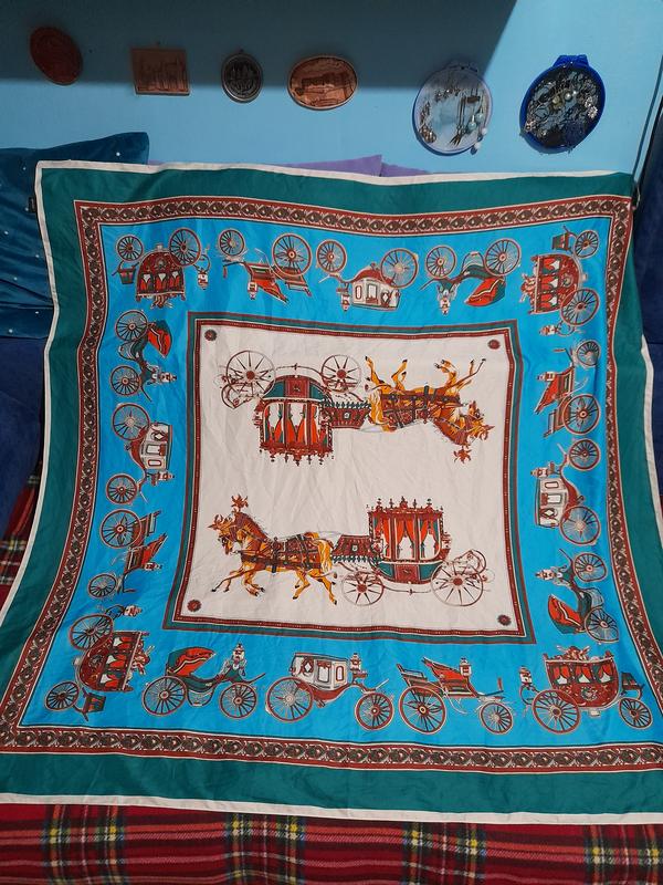Продам винтажный платок из шелка. принт лошады, кареты. размер 130×130 см. есть незаметная затяжка на белом.