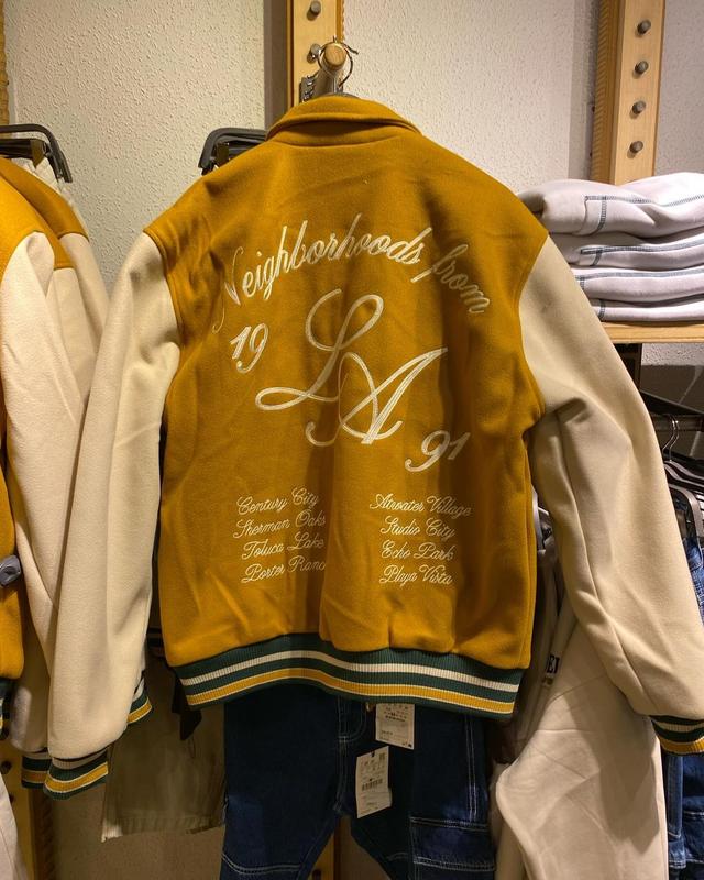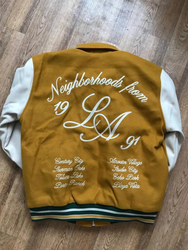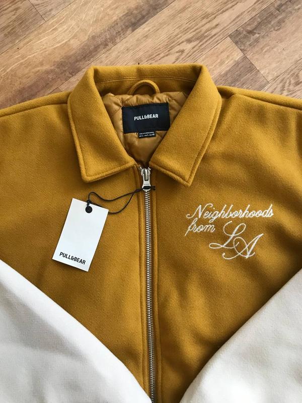 Фетровая куртка горчичного цвета с контрастной вышивкой, рубашечным воротником, боковыми карманами и окантовкой в рубчик.