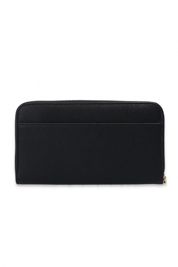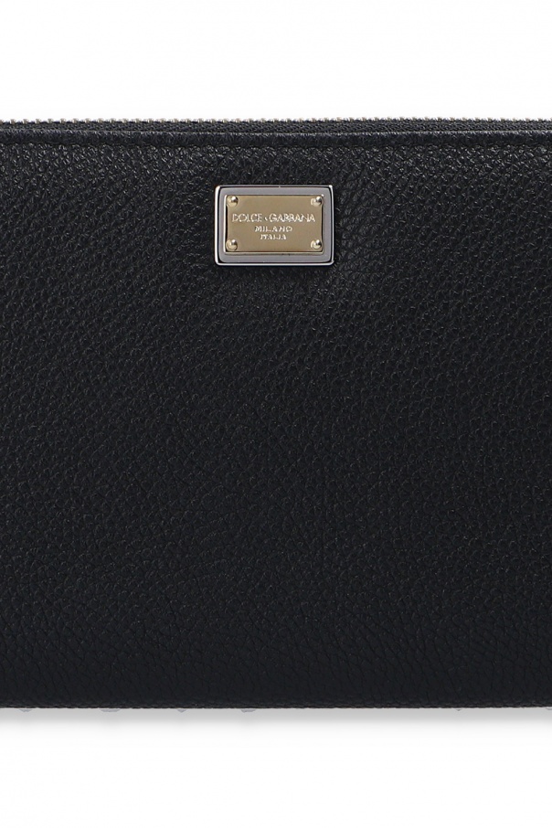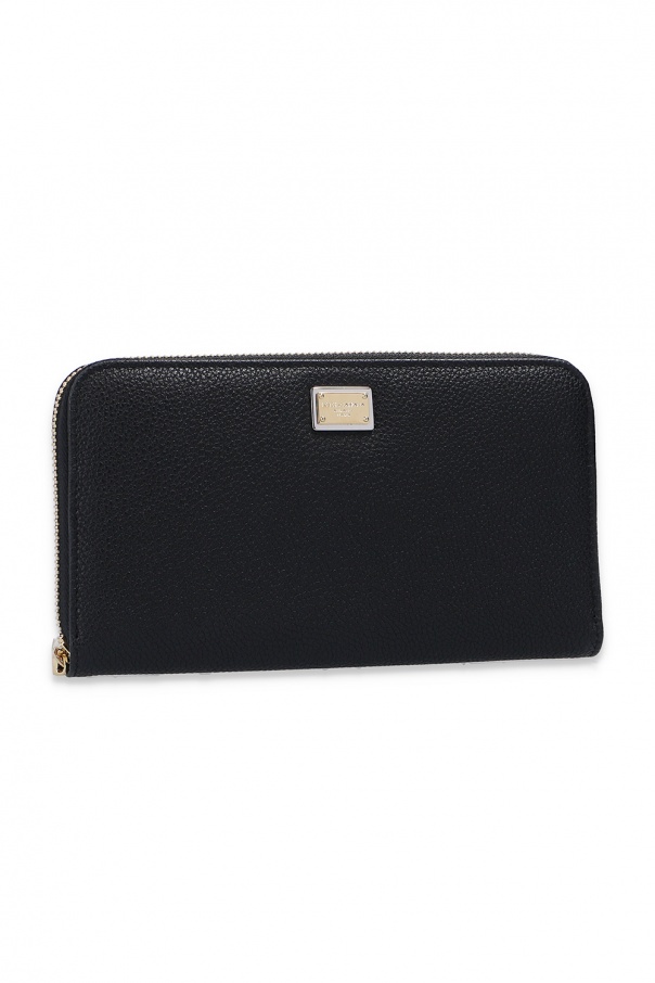 Black wallet from Dolce & Gabbana. Spruced up with a logo-embossed patch, this leather-crafted accessory fastens via zip and employs an external slip pocket on the back, gold-tone metal fittings and interior with three compartments, two slip pockets, one zipped pocket and twelve card slots.