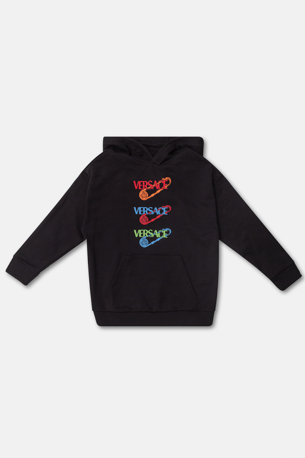 Black hoodie from Versace Kid. Crafted from cotton, this long sleeve design showcases a multicolored logo embroidery with the label’s signature safety pin and Medusa head motif, slip pocket and ribbed trims at the hem and cuffs.