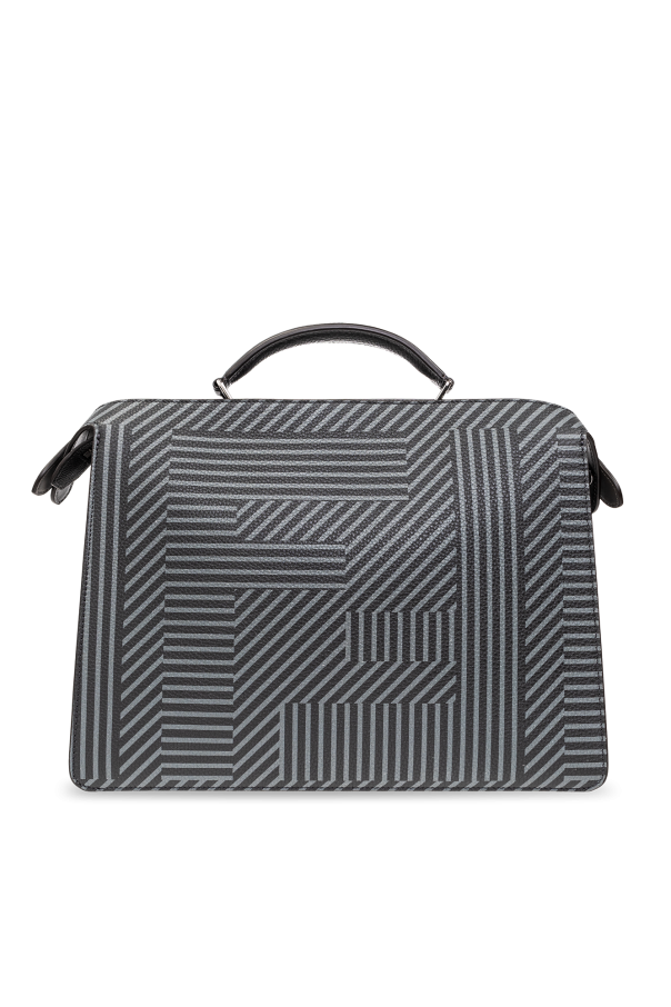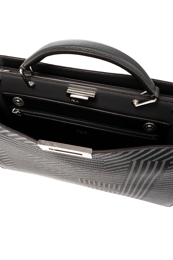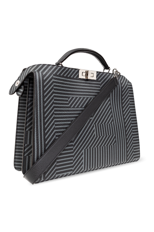 Black and grey ‘Peekaboo IseeU Medium’ shoulder bag from Fendi. Made of leather, this design has two separate internal compartments: one with zip fastening, the other with the iconic twist closure. It is decorated with a light grey Fendi Shadow print and complete with a half-round handle, detachable and adjustable shoulder strap, silver-tone metal hardware and a removable zipped pouch.