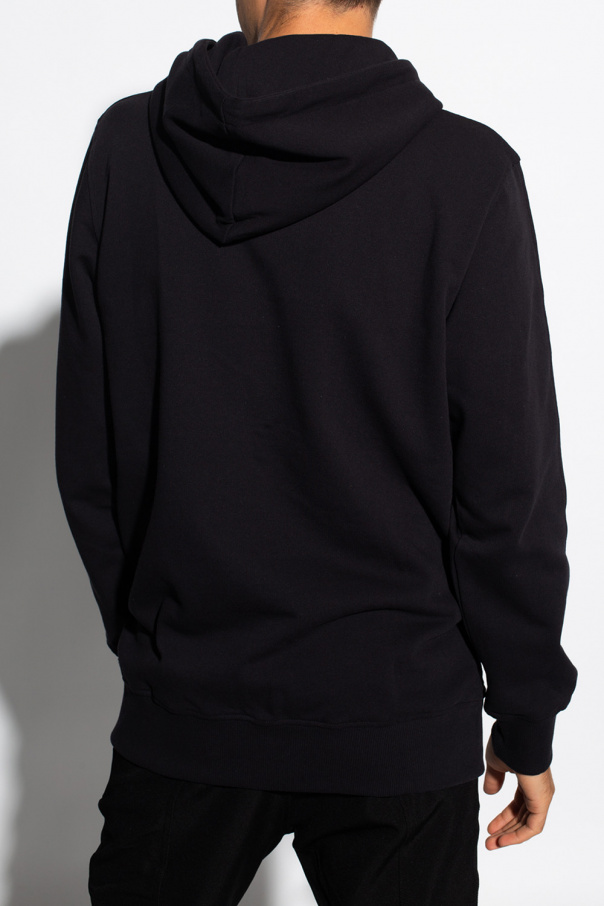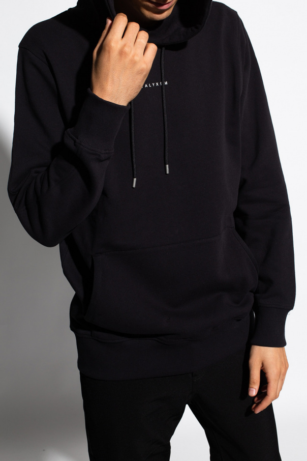 Black hoodie from 1017 ALYX 9SM. Crafted from cotton, this garment features a drawstring hood, white logo print, slip pocket and ribbed trims at the hem and cuffs.