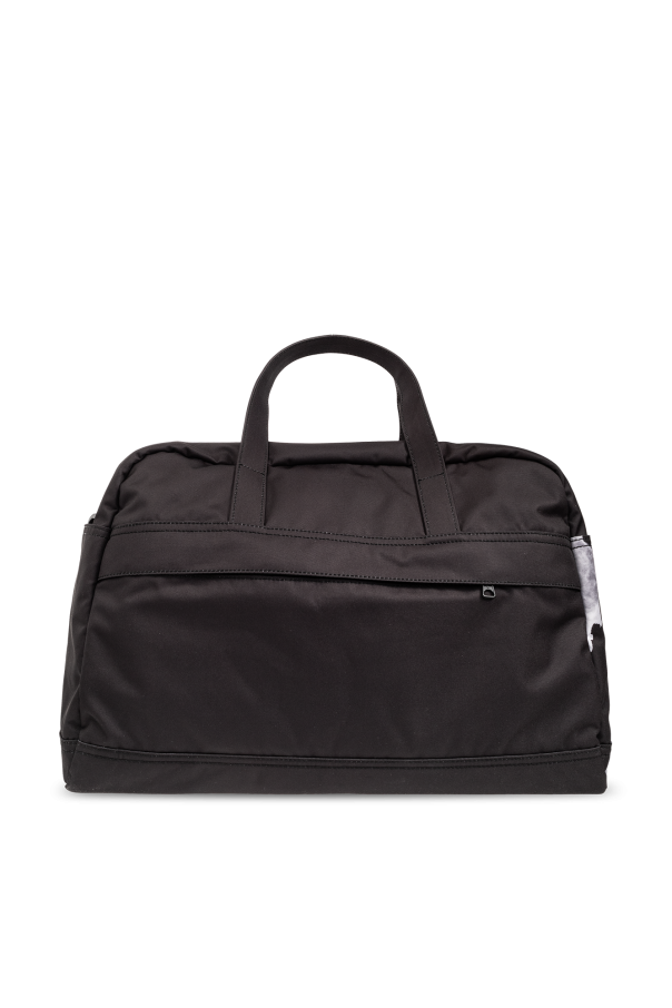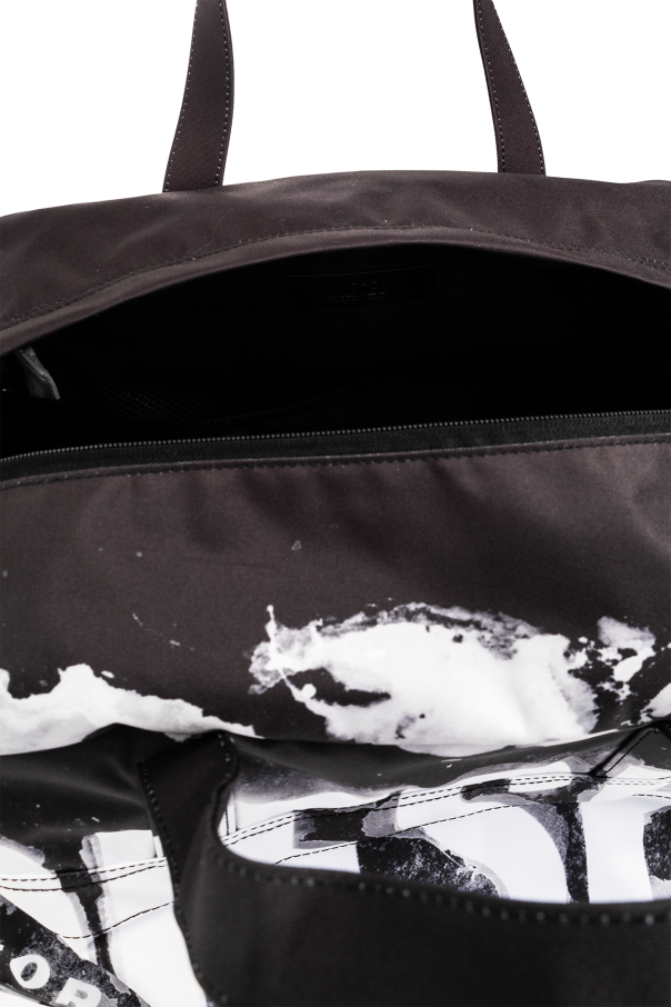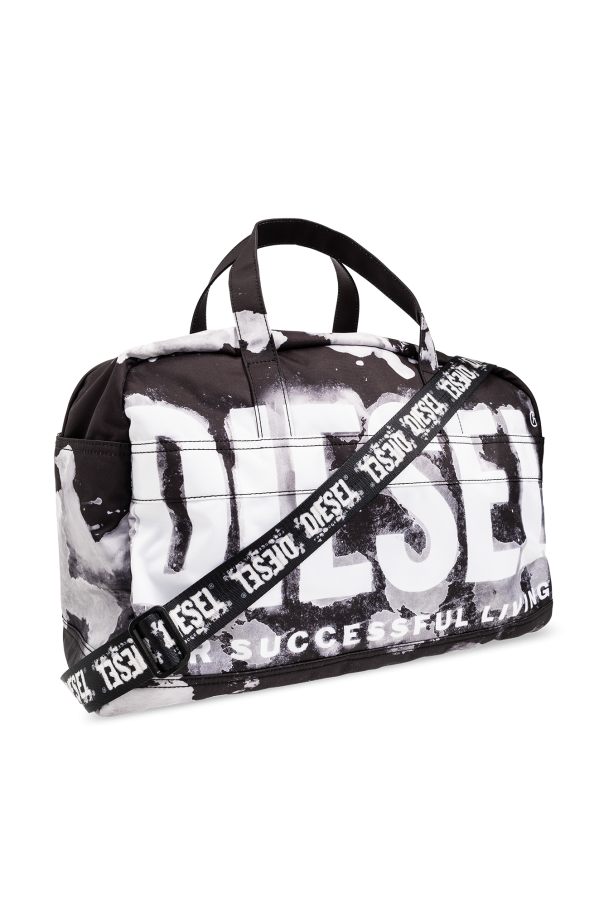 Black ‘RAVE DUFFLE’ duffel bag from Diesel. Made of fabric, this design fastens via a two-way zip and showcases a grey and white graphic print with the brand\'s logo, slip pockets on the sides, one zip pocket on the back, a detachable and adjustable strap, two half-round handles and one internal compartment with two zip pockets and two slip pockets.