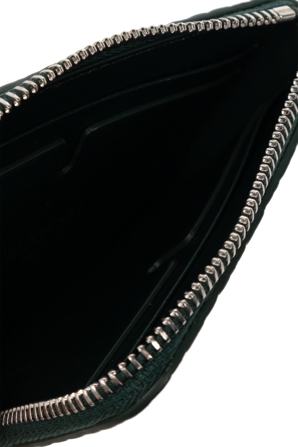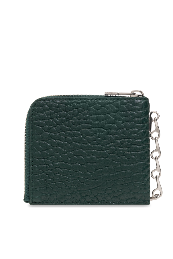 Dark green wallet with a chain from Burberry. Made of calf leather, this item features a zip fastening, embossed logo, silver-tone metal hardware and one internal compartment with four card slots.
