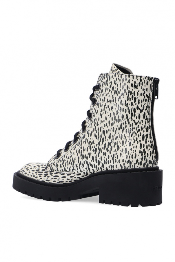 Beige and black heeled lace-up ankle boots from Kenzo. Made of leather with a snakeskin effect. Decorated with a printed pattern. Zip fastening at the back. Black rubber sole.