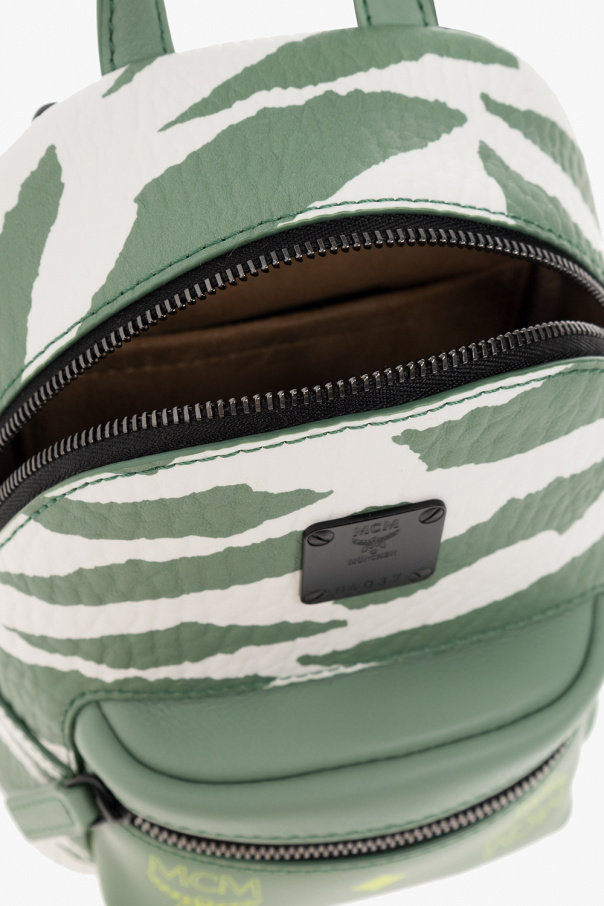 Green and white one-shoulder backpack from MCM. Crafted from faux leather, this design fastens with a zip and showcases an animal motif, logo-engraved hardware accompanied by a zip pocket flaunting the brand\'s ‘Visetos’ monogram on the front, a top handle, a detachable and adjustable shoulder strap and one internal compartment with a slip pocket.