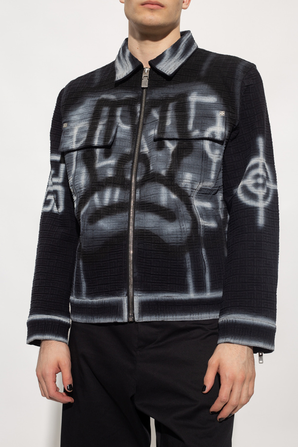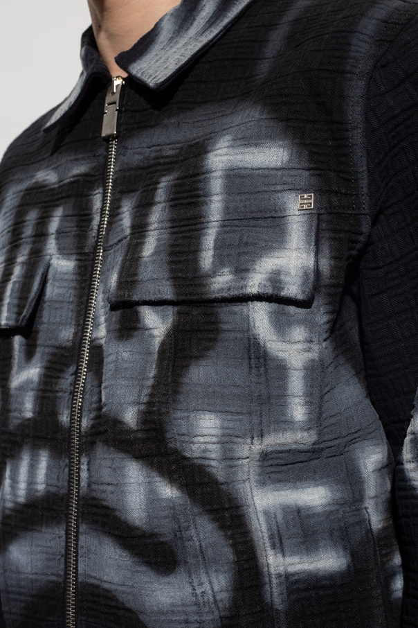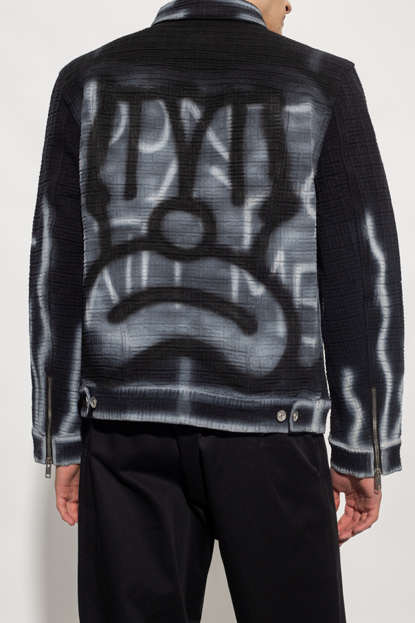 Black denim jacket from Givenchy x Chito. Crafted from cotton with an embossed monogram motif all-over, this style features a silver-tone zip fastening, a white, grey and black graphic print, four pockets (two with flaps), and silver-tone logo applications.