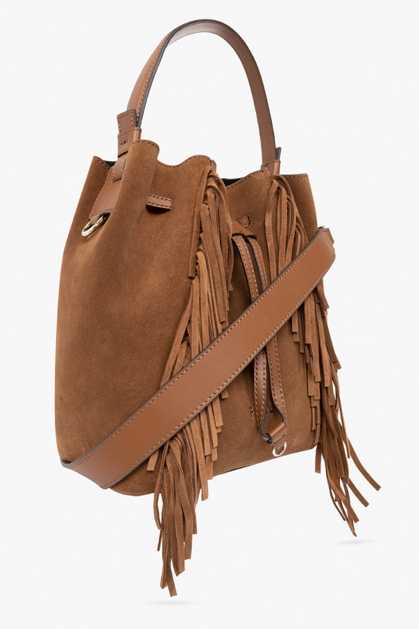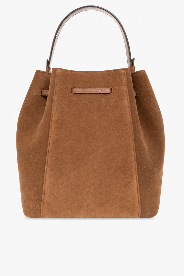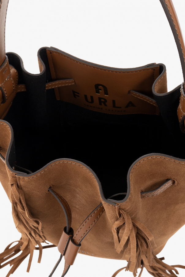 Brown ‘Miastella Small’ bucket bag from Furla. Crafted from leather and suede, this design cinches closed with drawstrings on the front and features an embossed logo and fringe detailing, a half-round handle, a detachable and adjustable shoulder strap, light gold-tone metal hardware and one internal compartment with two slip pockets.