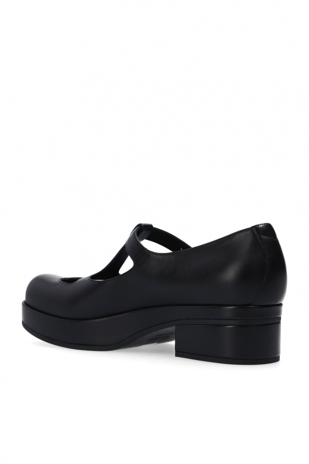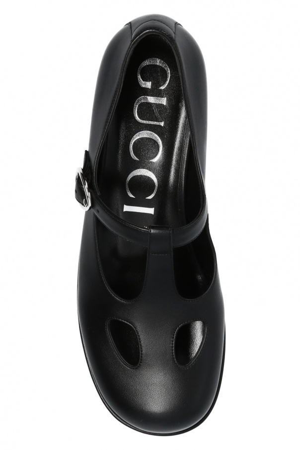 Black ‘Mary Jane’ low-heel shoes from Gucci. Crafted from leather, this statement-making pair sits on a black platform rubber sole and showcases cut-out details, round toe and double G details.