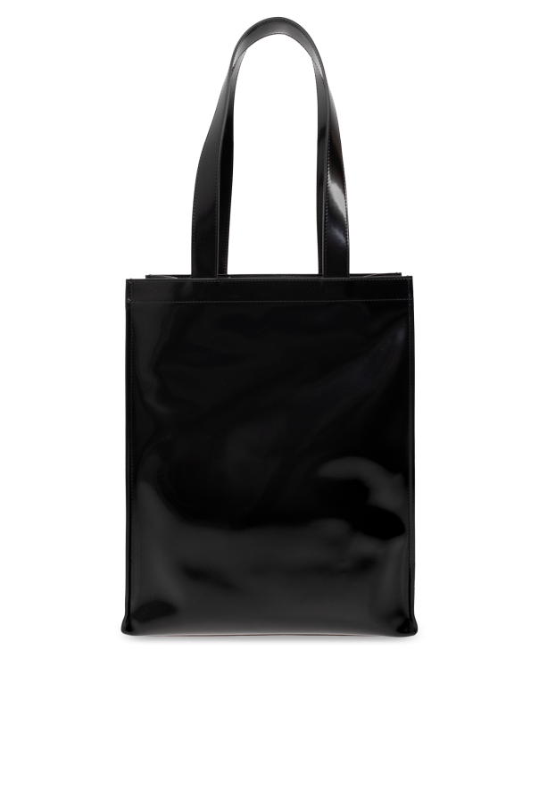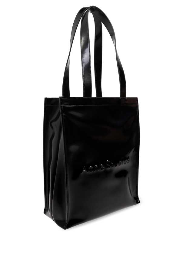 Black shopper bag from Acne Studios. Crafted from faux leather with a glossy finish, this model features a magnetic snap, tactile logo detail, two half-round handles, silver-tone metal hardware and one internal compartment with one slip pocket and one zip pocket.